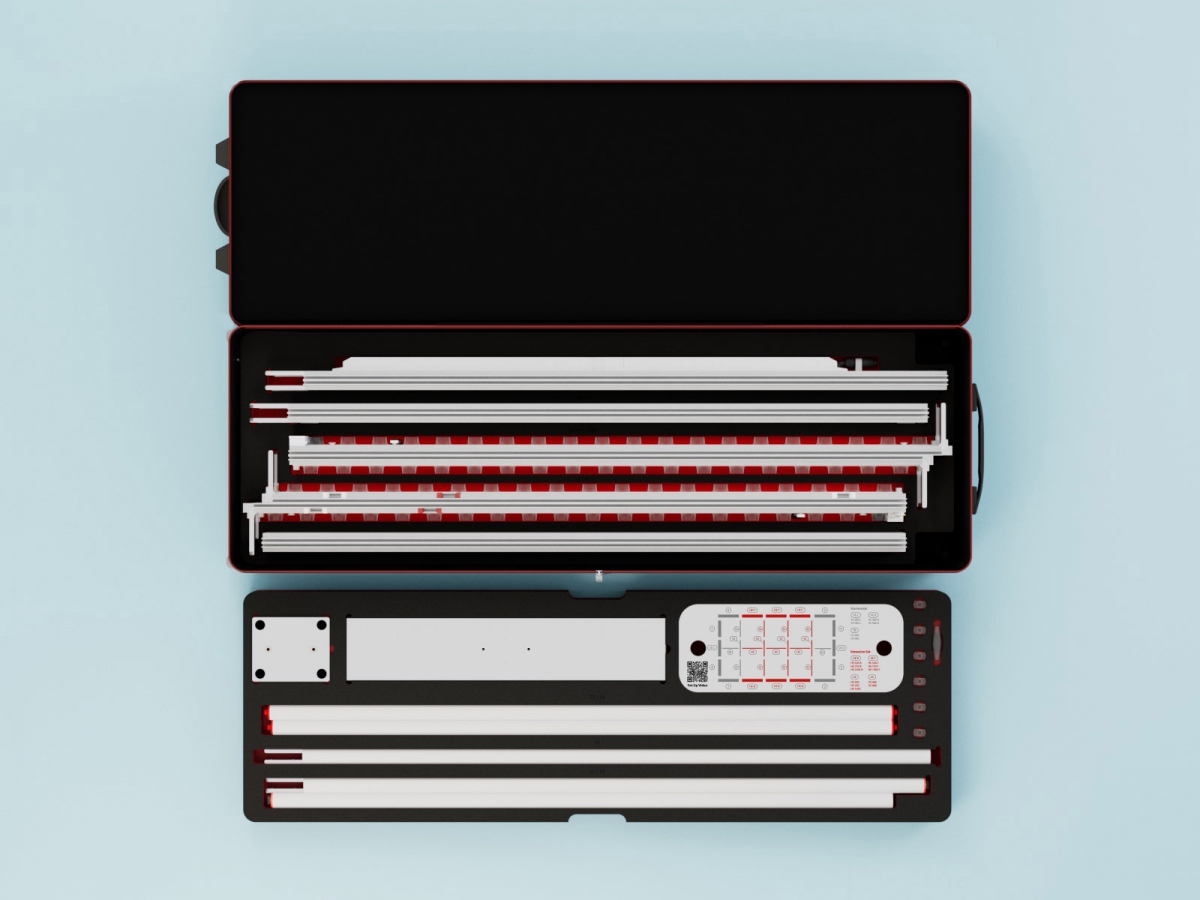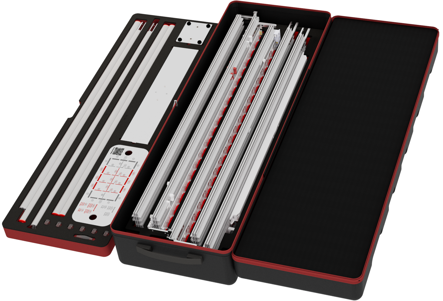 Jedes Teil ist eindeutig beschriftet, sodass sich sein Platz im Hartschalenkoffer leicht finden lässt. Exakt angepasste Schaumstoffeinlagen mit passenden Fräsungen schützen alle Systemteile im Inneren des Koffers vor Transportschäden.